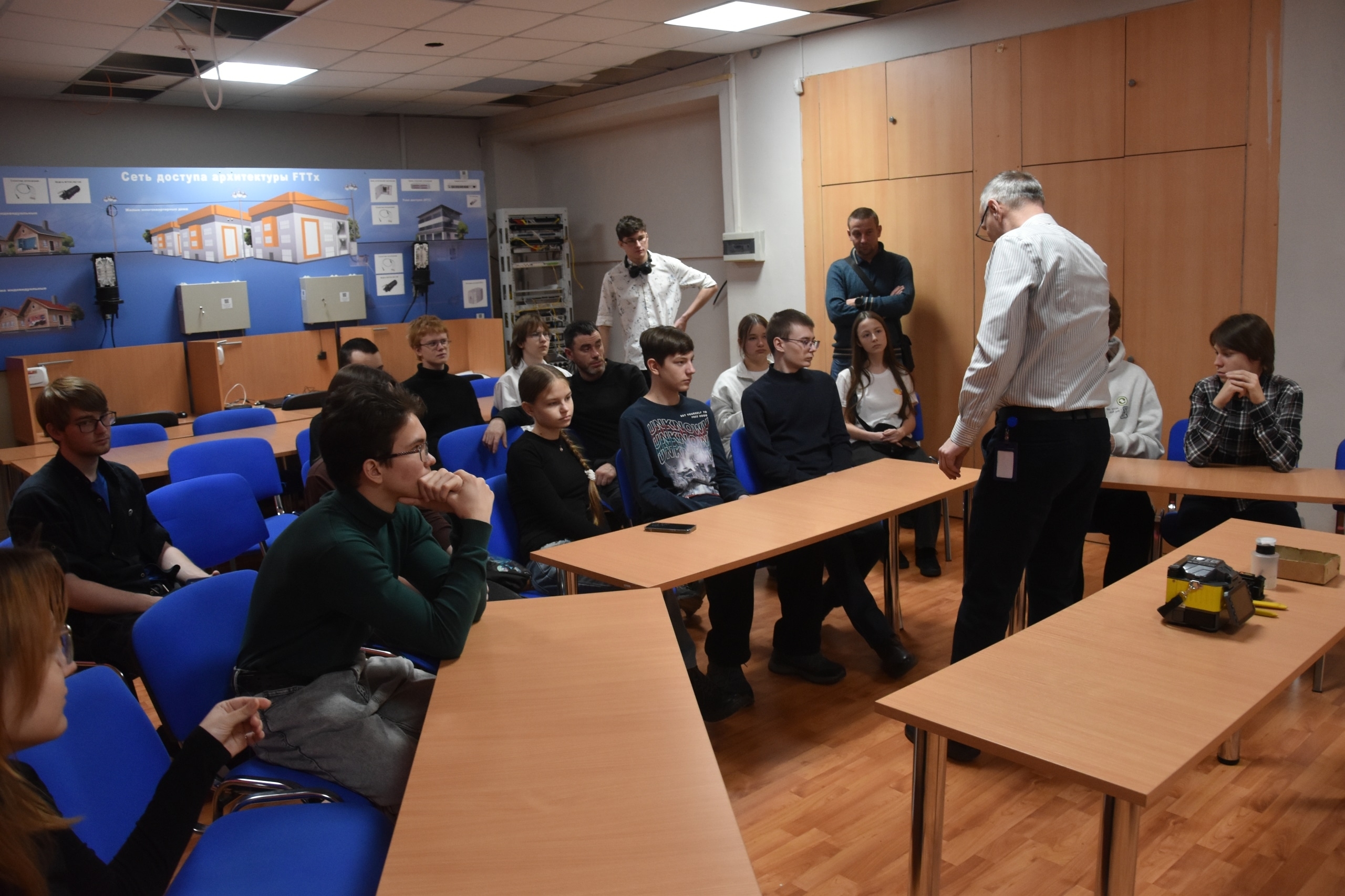Старшие преподаватели кафедры Инфокоммуникационных технологий и мобильной связи Евгения Юрченко и Савелий Плеханов представили основные направления подготовки и показали оборудование, используемое в телекоммуникациях. Старший преподаватель Дмитрий Овчинников и преподаватель Каранин Олег провели мастер-класс с оборудованием, с которым работают студенты.